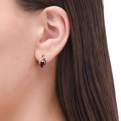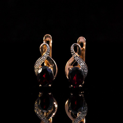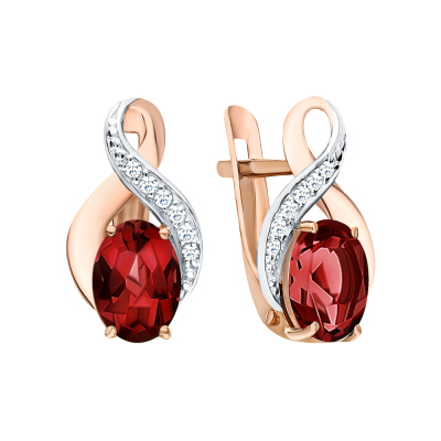 Серьги с 12 бриллиантами природными, 0.04 карат, огранка круг 17 граней, цвет 2, чистота 2, тип огранки А; 2 гранатами природными, 1.86 карат; Розовое золото 585 пробы.
