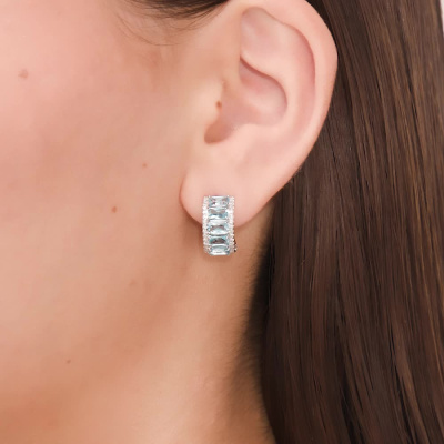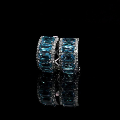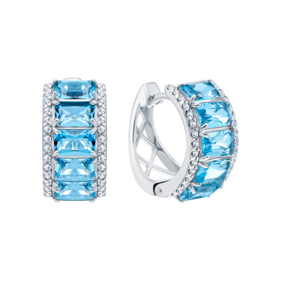 Серьги с 60 бриллиантами природными, 0.19 карат, огранка круг 17 граней, цвет 2, чистота 2, тип огранки Б; 10 топазами свисс природными, 3.59 карат; Белое золото 585 пробы.