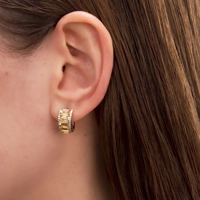 Серьги с 60 бриллиантами природными, 0.2 карат, огранка круг 17 граней, цвет 2, чистота 2, тип огранки А; 10 цитринами природными, 2.55 карат; Желтое золото 585 пробы.