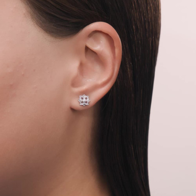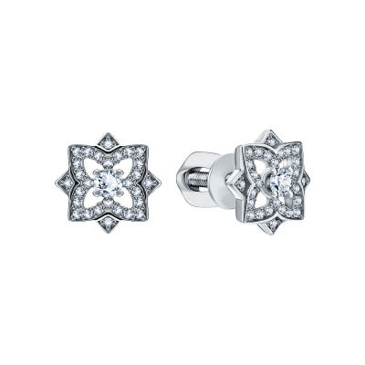 Серьги с 2 бриллиантами природными, 0.07 карат, огранка круг 57 граней, цвет 4, чистота 6, тип огранки А; 56 бриллиантами природными, 0.1 карат, огранка круг 17 граней, цвет 2, чистота 2, тип огранки А; Белое золото 585 пробы.