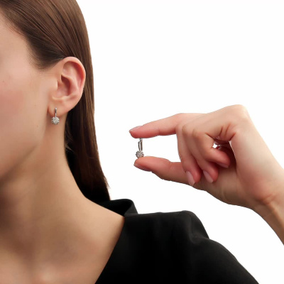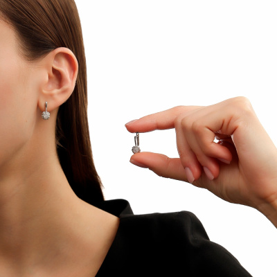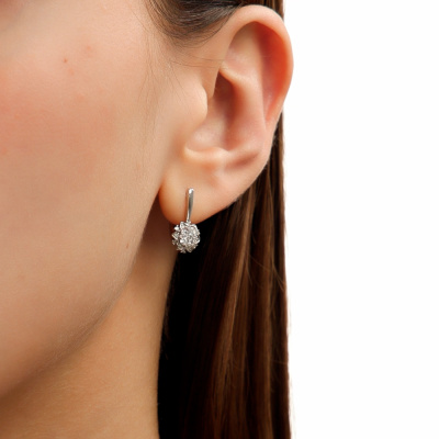 Серьги с 8 бриллиантами природными, 0.19 карат, огранка круг 57 граней, цвет 3, чистота 6, тип огранки А; 2 бриллиантами природными, 0.01 карат, огранка круг 57 граней, цвет 3, чистота 6, тип огранки А; 32 бриллиантами природными, 0.13 карат, огранка круг 17 граней, цвет 2, чистота 2, тип огранки А; Белое золото 585 пробы.