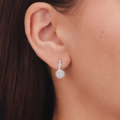 Серьги с 8 бриллиантами природными, 0.37 карат, огранка круг 57 граней, цвет 3, чистота 6, тип огранки А; 2 бриллиантами природными, 0.02 карат, огранка круг 57 граней, цвет 3, чистота 6, тип огранки А; 40 бриллиантами природными, 0.16 карат, огранка круг 17 граней, цвет 2, чистота 2, тип огранки Б; 14 бриллиантами природными, 0.03 карат, огранка круг 17 граней, цвет 2, чистота 2, тип огранки Б; Белое золото 585 пробы.