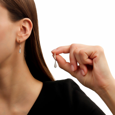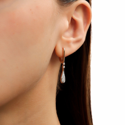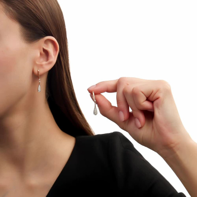 Серьги с 4 бриллиантами природными, 0.05 карат, огранка круг 57 граней, цвет 4, чистота 6, тип огранки А; 32 бриллиантами природными, 0.14 карат, огранка круг 17 граней, цвет 2, чистота 2, тип огранки А; 6 бриллиантами природными, 0.01 карат, огранка круг 17 граней, цвет 2, чистота 2, тип огранки А; Розовое золото 585 пробы.