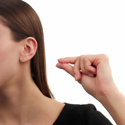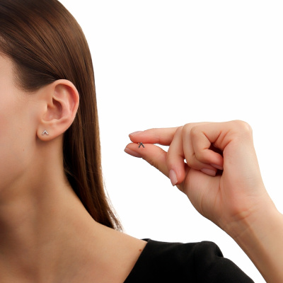 Серьги с 7 бриллиантами природными, 0.02 карат, огранка круг 17 граней, цвет 2, чистота 2, тип огранки А; 7 бриллиантами черными природными облагороженными, 0.02 карат, огранка круг 57 граней, цвет 7, чистота 6, тип огранки А; Белое золото 585 пробы.