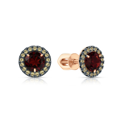 Серьги с 2 гранатами природными, 1.22 карат; 34 бриллиантами коньячными природными, 0.16 карат, огранка круг 57 граней, цвет 7, чистота 6, тип огранки А; Розовое золото 585 пробы.