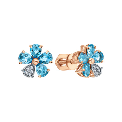Серьги с 10 бриллиантами природными, 0.02 карат, огранка круг 17 граней, цвет 2, чистота 2, тип огранки А; 8 топазами свисс природными, 1.4 карат; Розовое золото 585 пробы.