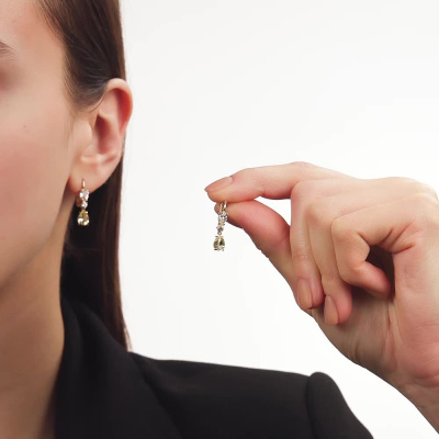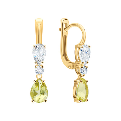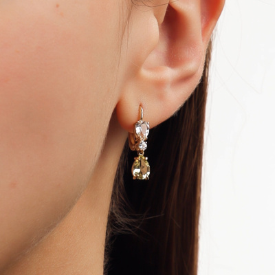 Серьги с 2 кварцами лимонными природными, 1.23 карат; 2 горными хрусталями природными, 0.67 карат; 2 топазами бесцветными природными, 0.15 карат; Желтое золото 585 пробы.