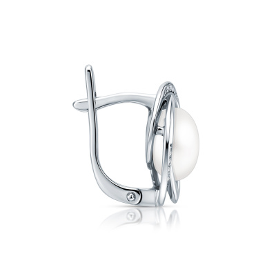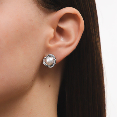 Серьги с 30 бриллиантами природными, 0.06 карат, огранка круг 17 граней, цвет 2, чистота 2, тип огранки А; 2 жемчугами пресноводными культ.белыми; Белое золото 585 пробы.