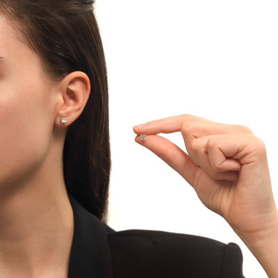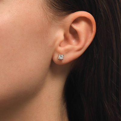 Серьги с 2 бриллиантами природными, 0.81 карат, огранка принцесса 65 граней, цвет 3, чистота 6, тип огранки А; 48 бриллиантами природными, 0.1 карат, огранка круг 17 граней, цвет 2, чистота 2, тип огранки А; Белое золото 585 пробы.