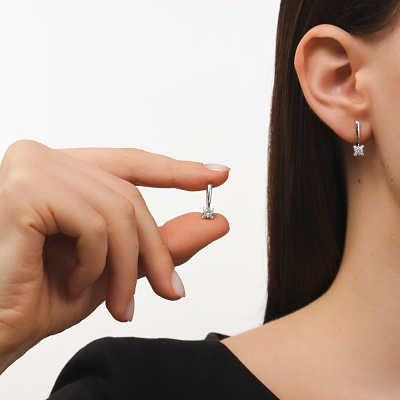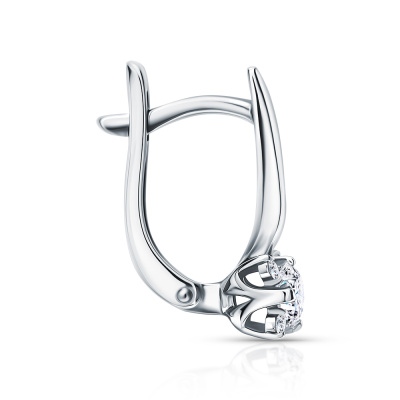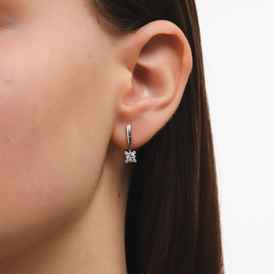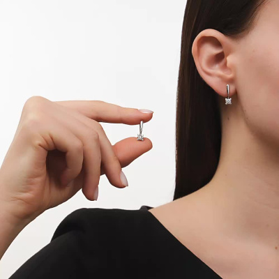 Серьги с 2 бриллиантами природными, 0.39 карат, огранка круг 57 граней, цвет 3, чистота 6, тип огранки А; 8 бриллиантами природными, 0.08 карат, огранка круг 57 граней, цвет 3, чистота 6, тип огранки А; Белое золото 585 пробы.