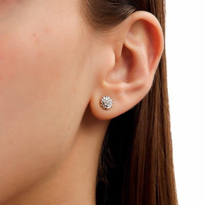 Серьги с 2 бриллиантами природными, 0.04 карат, огранка круг 57 граней, цвет 3, чистота 6, тип огранки А; 12 бриллиантами природными, 0.08 карат, огранка круг 57 граней, цвет 3, чистота 6, тип огранки А; Розовое и белое золото 585 пробы.