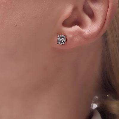 Серьги с 2 бриллиантами природными, 0.11 карат, огранка круг 57 граней, цвет 4, чистота 5, тип огранки А; 24 бриллиантами природными, 0.11 карат, огранка круг 17 граней, цвет 2, чистота 2, тип огранки А; Розовое и белое золото 585 пробы.