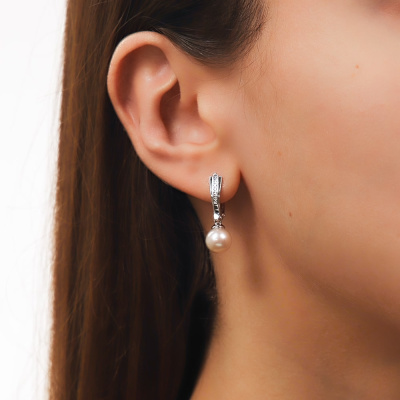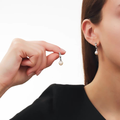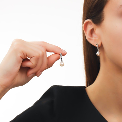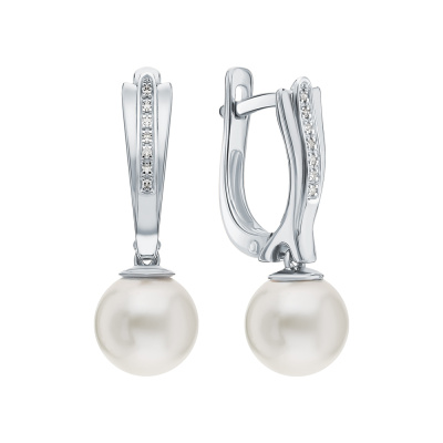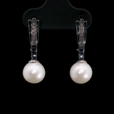 Серьги с 14 бриллиантами природными, 0.03 карат, огранка круг 17 граней, цвет 2, чистота 2, тип огранки А; 2 жемчугами пресноводными культ.белыми; Белое золото 585 пробы.