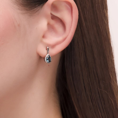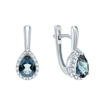 Серьги с 34 бриллиантами природными, 0.12 карат, огранка круг 17 граней, цвет 2, чистота 2, тип огранки А; 2 топазами лондон природными, 1.54 карат; Белое золото 585 пробы.