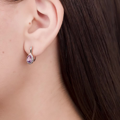 Серьги с 34 бриллиантами природными, 0.11 карат, огранка круг 17 граней, цвет 2, чистота 2, тип огранки А; 2 аметистами природными, 1.26 карат; Розовое золото 585 пробы.