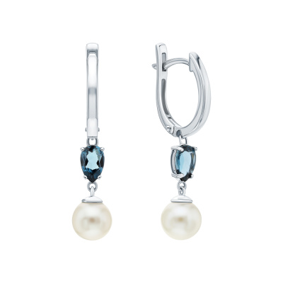 Серьги с 2 топазами лондон природными, 0.87 карат; 2 жемчугами пресноводными культ.белыми; Белое золото 585 пробы.