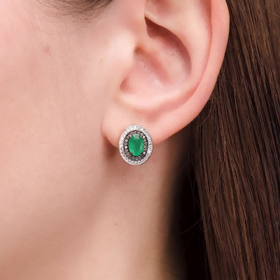Серьги с 56 бриллиантами природными, 0.23 карат, огранка круг 17 граней, цвет 2, чистота 2, тип огранки Б; 2 изумрудами природными, 1.33 карат, цвет 3, чистота 3, тип огранки Б; 44 бриллиантами коньячными природными, 0.15 карат, огранка круг 57 граней, цвет 7, чистота 6, тип огранки А; Розовое золото 585 пробы.