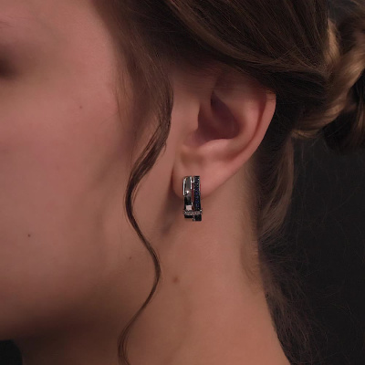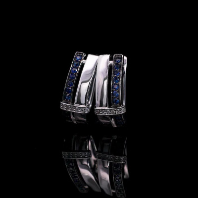 Серьги с 14 бриллиантами природными, 0.05 карат, огранка круг 17 граней, цвет 2, чистота 2, тип огранки Б; 18 сапфирами природными, 0.31 карат, цвет 2, чистота 2, тип огранки В; Белое золото 585 пробы.
