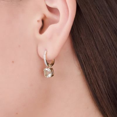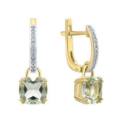 Серьги с 22 бриллиантами природными, 0.04 карат, огранка круг 17 граней, цвет 2, чистота 2, тип огранки Б; 2 празиолитами природными, 2.61 карат; Желтое золото 585 пробы.