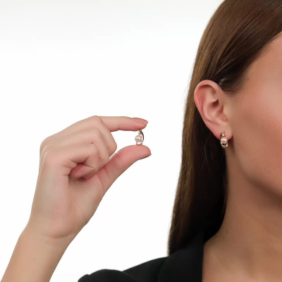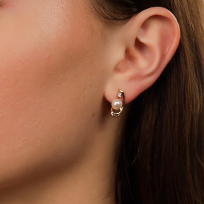 Серьги с 2 бриллиантами природными, 0.04 карат, огранка круг 57 граней, цвет 3, чистота 6, тип огранки А; 2 жемчугами пресноводными культ.белыми; Розовое золото 585 пробы.