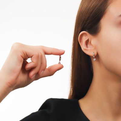 Серьги с 2 бриллиантами природными, 0.06 карат, огранка круг 57 граней, цвет 3, чистота 6; 2 бриллиантами природными, 0.008 карат, огранка круг 17 граней, цвет 2, чистота 2; Розовое золото 375 пробы.