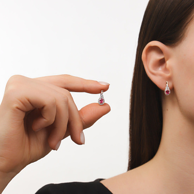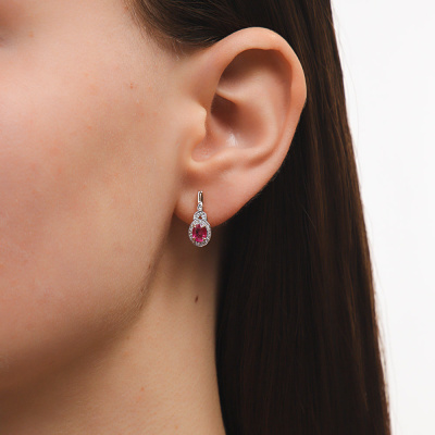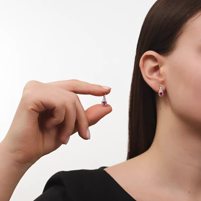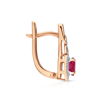 Серьги с 46 бриллиантами природными, 0.09 карат, огранка круг 17 граней, цвет 2, чистота 2, тип огранки А; 2 рубинами природными, 0.77 карат, цвет 2, чистота 2, тип огранки Б; Розовое золото 585 пробы.