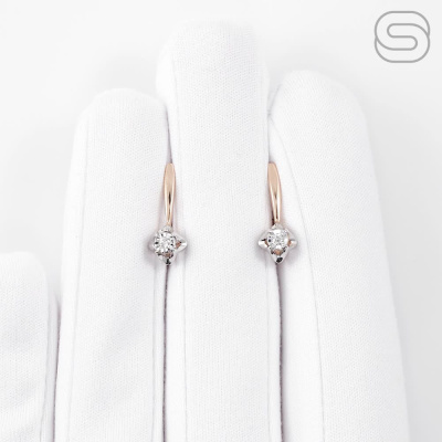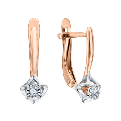 Серьги с 2 бриллиантами природными, 0.04 карат, огранка круг 57 граней, цвет 3, чистота 6; Розовое и белое золото 375 пробы.