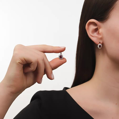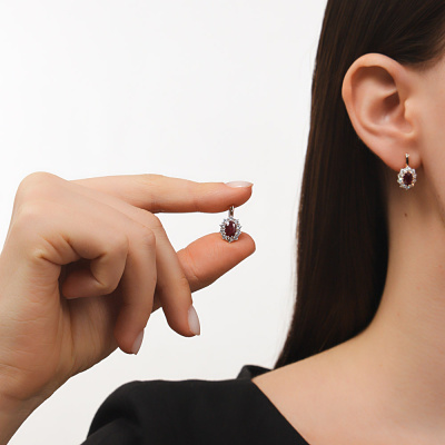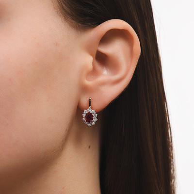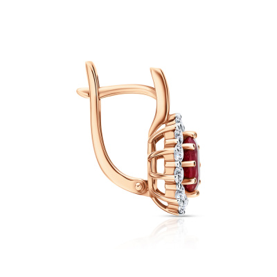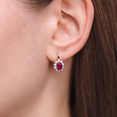 Серьги с 20 бриллиантами природными, 0.71 карат, огранка круг 57 граней, цвет 3, чистота 6, тип огранки А; 2 рубинами природными, 1.75 карат, цвет 2, чистота 3, тип огранки Б; Розовое золото 585 пробы.