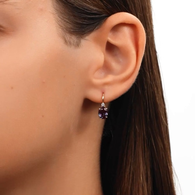 Серьги с 2 бриллиантами природными, 0.05 карат, огранка круг 57 граней, цвет 3, чистота 6, тип огранки А; 2 александритами синтетическими, 3.1 карат; Розовое золото 585 пробы.
