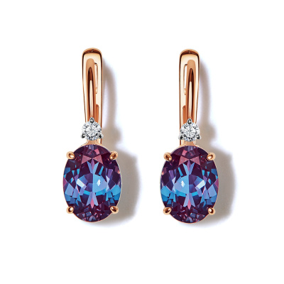 Серьги с 2 бриллиантами природными, 0.05 карат, огранка круг 57 граней, цвет 3, чистота 6, тип огранки А; 2 александритами синтетическими, 3.13 карат; Розовое золото 585 пробы.