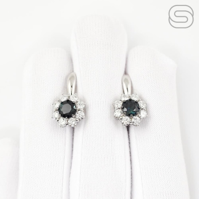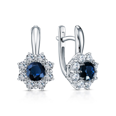 Серьги с 16 бриллиантами природными, 1.27 карат, огранка круг 57 граней, цвет 3, чистота 6, тип огранки А; 2 сапфирами природными, 1.49 карат, цвет 2, чистота 2, тип огранки В; Белое золото 585 пробы.