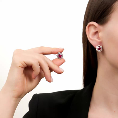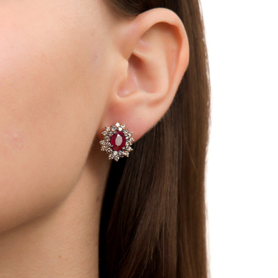 Серьги с 2 рубинами природными, 2.65 карат, цвет 2, чистота 3, тип огранки Б; 12 бриллиантами коньячными природными, 0.68 карат, огранка круг 57 граней, цвет 7, чистота 5, тип огранки А; 24 бриллиантами коньячными природными, 0.71 карат, огранка круг 57 граней, цвет 7, чистота 5, тип огранки А; 12 бриллиантами коньячными природными, 0.33 карат, огранка круг 57 граней, цвет 7, чистота 5, тип огранки А; Розовое золото 585 пробы.