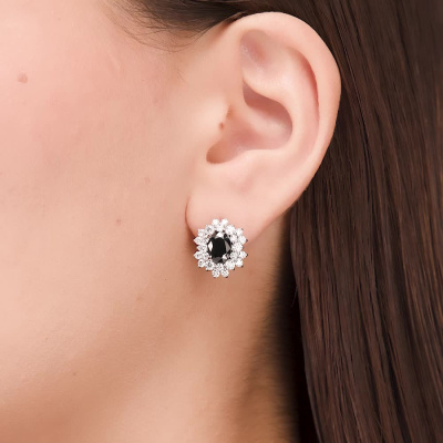 Серьги с 12 бриллиантами природными, 0.63 карат, огранка круг 57 граней, цвет 3, чистота 6, тип огранки А; 24 бриллиантами природными, 0.74 карат, огранка круг 57 граней, цвет 3, чистота 6, тип огранки А; 12 бриллиантами природными, 0.3 карат, огранка круг 57 граней, цвет 3, чистота 6, тип огранки А; 2 сапфирами природными, 2.76 карат, цвет 2, чистота 2, тип огранки Б; Белое золото 585 пробы.