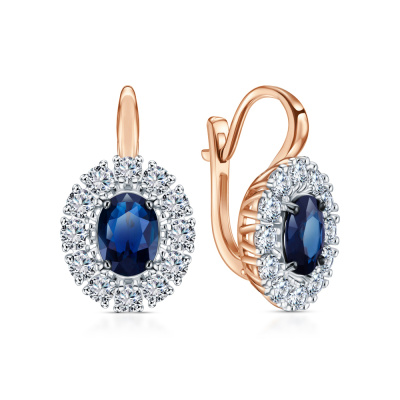 Серьги с 24 бриллиантами природными, 2.16 карат, огранка круг 57 граней, цвет 4, чистота 6, тип огранки А; 2 сапфирами природными, 2.98 карат, цвет 2, чистота 2, тип огранки Б; Розовое золото 585 пробы.