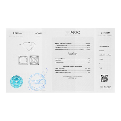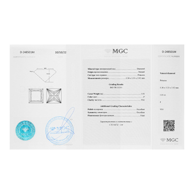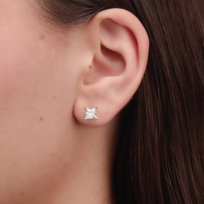 Серьги с 1 бриллиантом природным, 1 карат, огранка принцесса 65 граней, цвет 4, чистота 6, тип огранки А; 1 бриллиантом природным, 1 карат, огранка принцесса 65 граней, цвет 4, чистота 5, тип огранки А; Белое золото 585 пробы.
