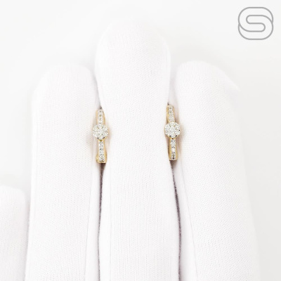 Серьги с 2 бриллиантами природными, 0.03 карат, огранка круг 57 граней, цвет 3, чистота 6, тип огранки А; 4 бриллиантами природными, 0.03 карат, огранка круг 57 граней, цвет 3, чистота 6, тип огранки А; 12 бриллиантами природными, 0.08 карат, огранка круг 57 граней, цвет 3, чистота 6, тип огранки А; 4 бриллиантами природными, 0.02 карат, огранка круг 57 граней, цвет 3, чистота 6, тип огранки А; 4 бриллиантами природными, 0.01 карат, огранка круг 57 граней, цвет 3, чистота 6, тип огранки А; Желтое золото 585 пробы.