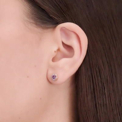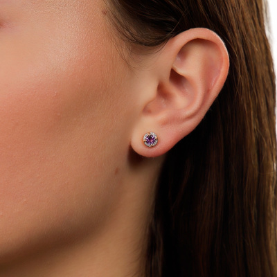 Серьги с 24 бриллиантами природными, 0.05 карат, огранка круг 17 граней, цвет 2, чистота 2, тип огранки А; 2 аметистами природными, 0.49 карат; Розовое золото 585 пробы.