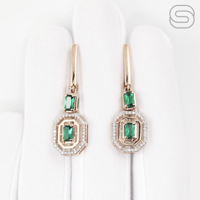 Серьги с 64 бриллиантами природными, 0.18 карат, огранка круг 17 граней, цвет 2, чистота 2, тип огранки А; 4 гидротермальными изумрудами, 0.86 карат; Розовое золото 585 пробы.