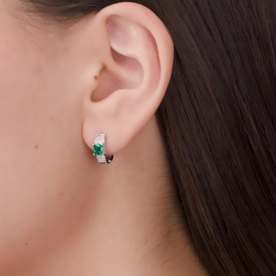 Серьги с 36 бриллиантами природными, 0.06 карат, огранка круг 17 граней, цвет 2, чистота 2, тип огранки А; 2 гидротермальными изумрудами, 0.6 карат, тип огранки Б; Белое золото 585 пробы.