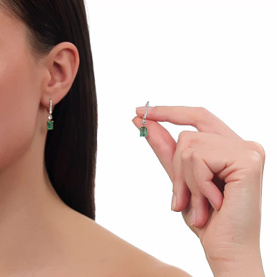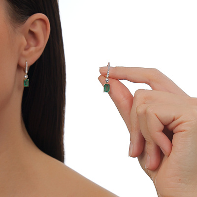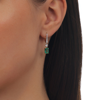 Серьги с 4 бриллиантами природными, 0.05 карат, огранка круг 57 граней, цвет 3, чистота 6, тип огранки А; 6 бриллиантами природными, 0.04 карат, огранка круг 57 граней, цвет 3, чистота 6, тип огранки А; 6 бриллиантами природными, 0.02 карат, огранка круг 17 граней, цвет 2, чистота 2, тип огранки А; 2 изумрудами природными, 1.84 карат, цвет 3, чистота 3, тип огранки Б; 2 сапфирами бесцветными природными, 0.25 карат; Желтое золото 585 пробы.