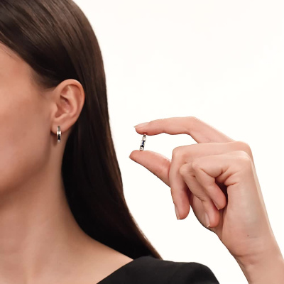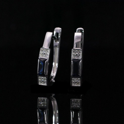 Серьги с 16 бриллиантами природными, 0.05 карат, огранка круг 17 граней, цвет 2, чистота 2, тип огранки А; 2 сапфирами синтетическими, 0.47 карат; Белое золото 585 пробы.