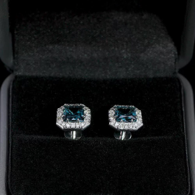 Серьги с 40 бриллиантами природными, 0.16 карат, огранка круг 17 граней, цвет 2, чистота 2, тип огранки А; 2 топазами лондон природными, 1.52 карат, тип огранки Б; Белое золото 585 пробы.