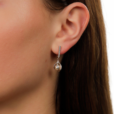 Серьги с 64 бриллиантами природными, 0.13 карат, огранка круг 17 граней, цвет 2, чистота 2, тип огранки А; 2 жемчугами пресноводными культ.белыми; Розовое золото 585 пробы.
