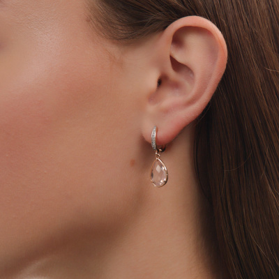 Серьги с 10 бриллиантами природными, 0.02 карат, огранка круг 17 граней, цвет 2, чистота 2, тип огранки А; 10 бриллиантами природными, 0.01 карат, огранка круг 17 граней, цвет 2, чистота 2, тип огранки А; 2 кварцами розовыми природными, 5.12 карат, тип огранки Б; Розовое золото 585 пробы.