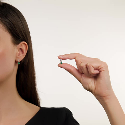 Серьги с 10 бриллиантами природными, 0.04 карат, огранка круг 17 граней, цвет 2, чистота 2, тип огранки А; 2 гидротермальными изумрудами, 0.66 карат; Розовое золото 585 пробы.