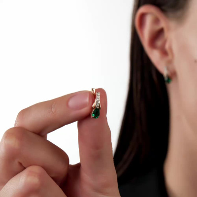 Серьги с 10 бриллиантами природными, 0.04 карат, огранка круг 17 граней, цвет 2, чистота 2, тип огранки А; 2 гидротермальными изумрудами, 0.77 карат; Розовое золото 585 пробы.