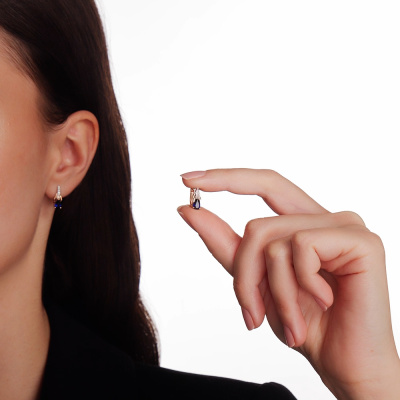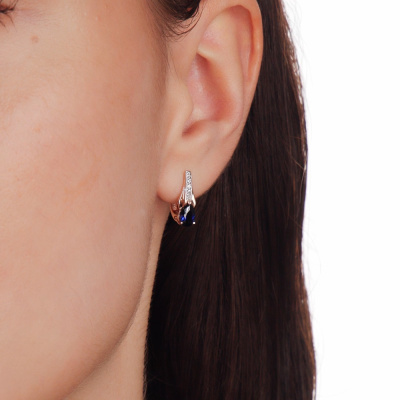 Серьги с 10 бриллиантами природными, 0.04 карат, огранка круг 17 граней, цвет 2, чистота 2, тип огранки А; 2 сапфирами синтетическими, 0.89 карат; Розовое золото 585 пробы.