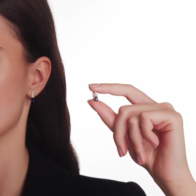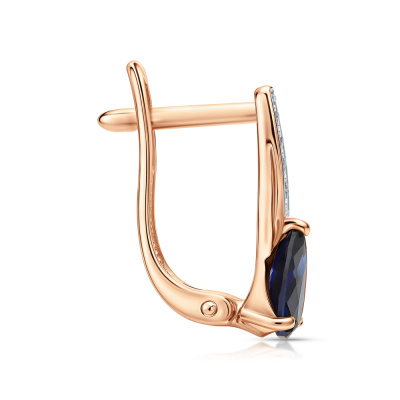 Серьги с 10 бриллиантами природными, 0.04 карат, огранка круг 17 граней, цвет 2, чистота 2, тип огранки А; 2 сапфирами синтетическими, 0.96 карат; Розовое золото 585 пробы.