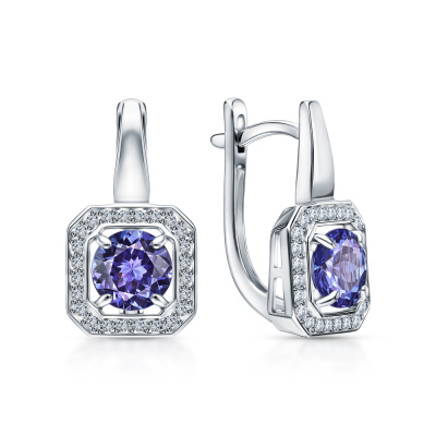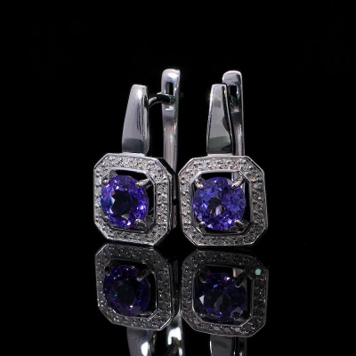 Серьги с 48 бриллиантами природными, 0.19 карат, огранка круг 17 граней, цвет 2, чистота 2, тип огранки Б; 2 танзанитами природными, 1.74 карат; Белое золото 585 пробы.