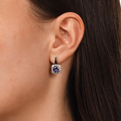 Серьги с 48 бриллиантами природными, 0.19 карат, огранка круг 17 граней, цвет 2, чистота 2, тип огранки А; 2 танзанитами природными, 1.64 карат; Белое золото 585 пробы.